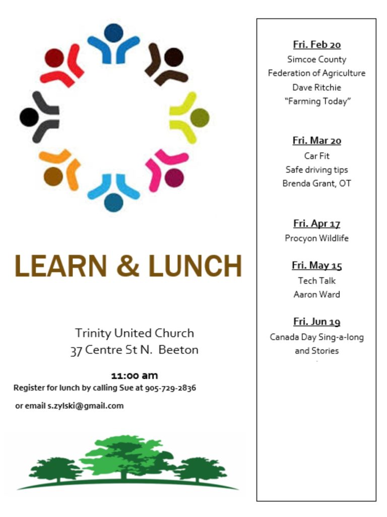 Seniors’ Learn & Lunch program – third Friday of the month September – June 11 am (See below for more details)